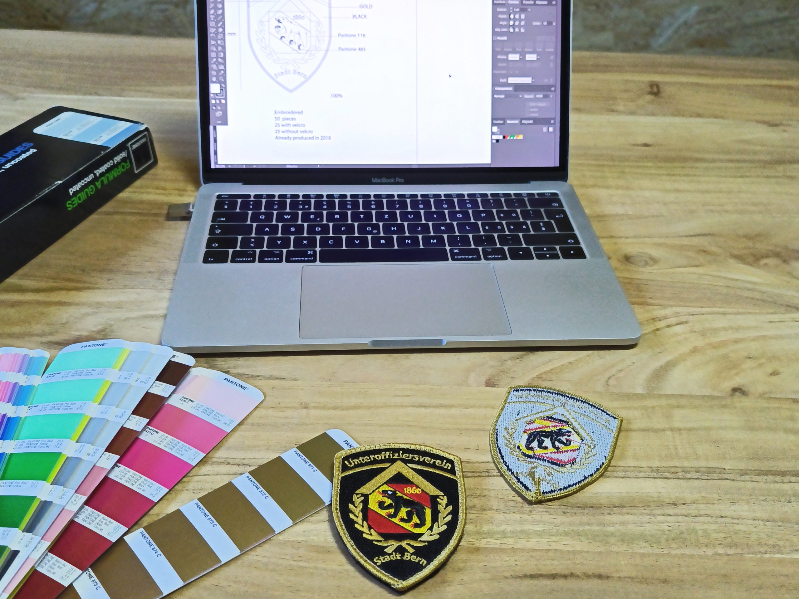 Sobald wir alle Informationen erhalten haben: Material (bestickt, gewebt, Soft PVC oder bedruckt), Menge, mit oder ohne Klettverschluss oder beides. Wir unterbreiten Ihnen ein Angebot mit den tatsächlichen Kosten (Abweichungen möglich bei zusätzlichem Designaufwand und/oder grossformatigen Abzeichen). Sobald Sie dieses Angebot angenommen haben, senden wir Ihnen die Rechnung zu. Nach Zahlungseingang beginnen wir mit der Gestaltung des Patches.